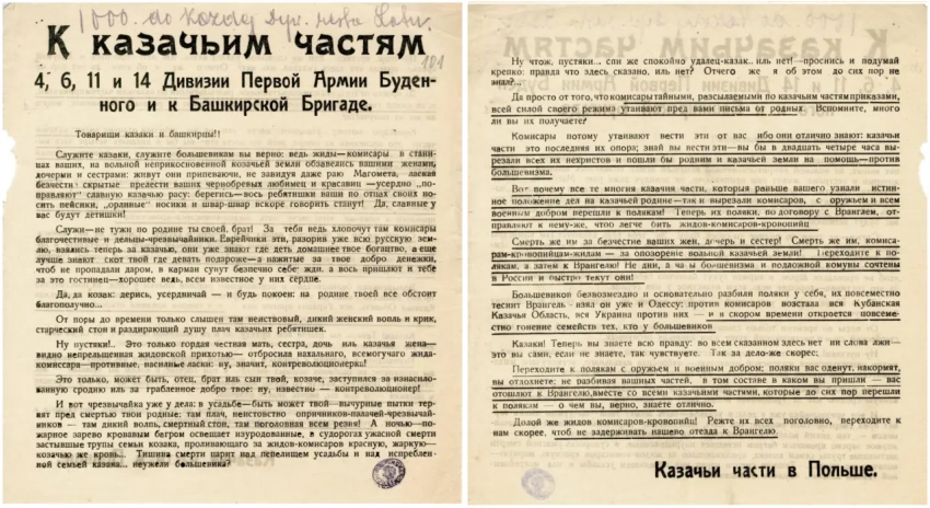 Листовка, обращающаяся к конкретным дивизиям и бригадам Красной Армии. Достаточно прогрессивный подход для того времени. Правда, пока что в листовках не содержится информация о потерях и трудностях, с которыми столкнулись данные военные формирования. Листовка доносит общие обращения к казачеству.