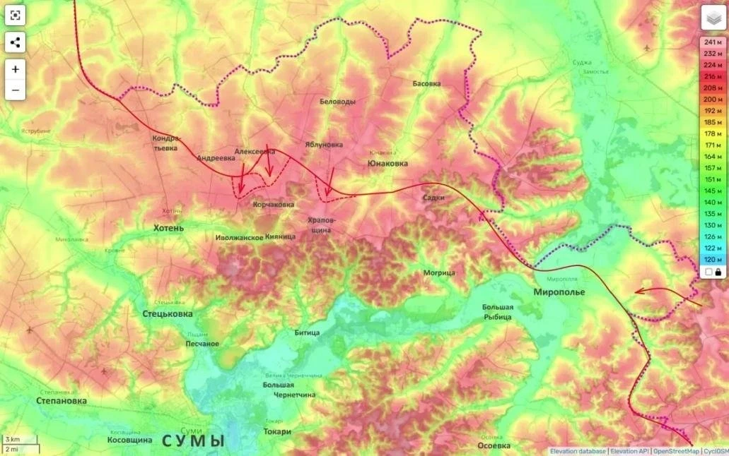 Параллельно расширяется зона контроля и в приграничных районах. Так, на Сумском направлении заняты новые позиции в лесных массивах по линии Корчаковка - Храповщина. Это даёт перспективу выхода к Иволжанскому и Киянице, а в дальнейшем - непосредственно к областному центру Сумы.