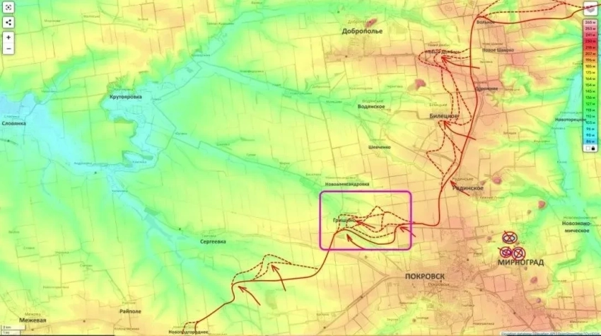Севернее - в треугольнике Покровск – Мирноград - Белицкое - продолжаются ожесточенные столкновения за Гришино. Потеря этого села, часть которого пока находится в серой зоне, окончательно обрушит позиции ВСУ между Белицким и Сергеевкой.