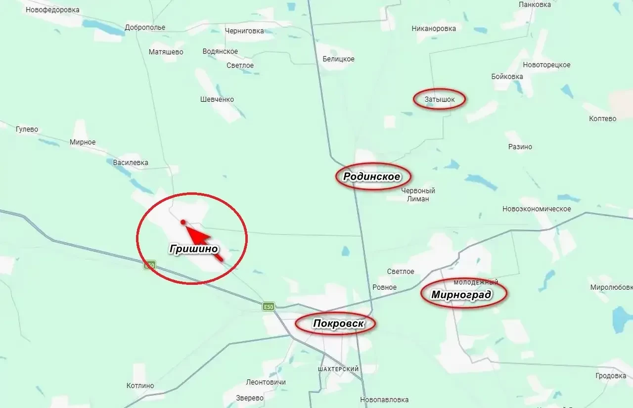 Несмотря на интенсивные контратаки противника, в результате наступательных действий подразделениям ВС РФ удалось развить успех на Покровском направлении и полностью освободить село Гришино, расположенное к северо-западу от Покровска (Красноармейска). В настоящее время отмечается дальнейшее продвижение в северо-западном направлении в сторону Васильевки.