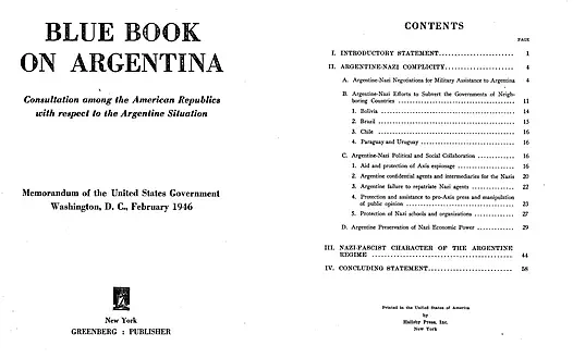 Используя захваченные немецкие архивы и расшифрованные радиограммы Оси, следователи Государственного департамента США подготовили «Синюю книгу» как раз к выборам. Ее данные в целом точны, но относятся в основном к периоду до политического подъема Перона в 1944 году, и ее интерпретации были сильно предвзяты против Аргентины.