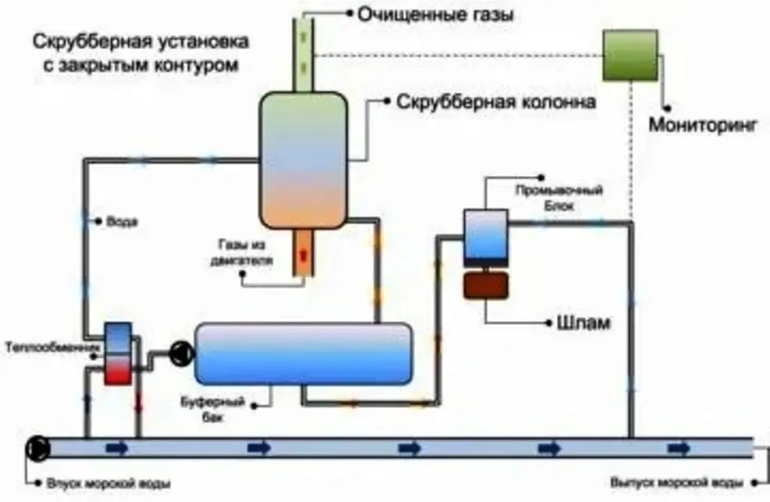 При использовании скрубберов в ECA можно применять и более сернистое топливо. В скруббере выхлопные газы орошаются водой (забортной или пресной), которая поглощает окислы серы и частично окислы азота с образованием кислот, а также сажу, которая собирается в шламовой цистерне. Отработавшая вода сбрасывается за борт, если это допускает местное законодательство (открытый цикл), или после нейтрализации щелочью и очистки от сажи возвращается в процесс (замкнутый цикл), при этом обычно используется пресная вода.