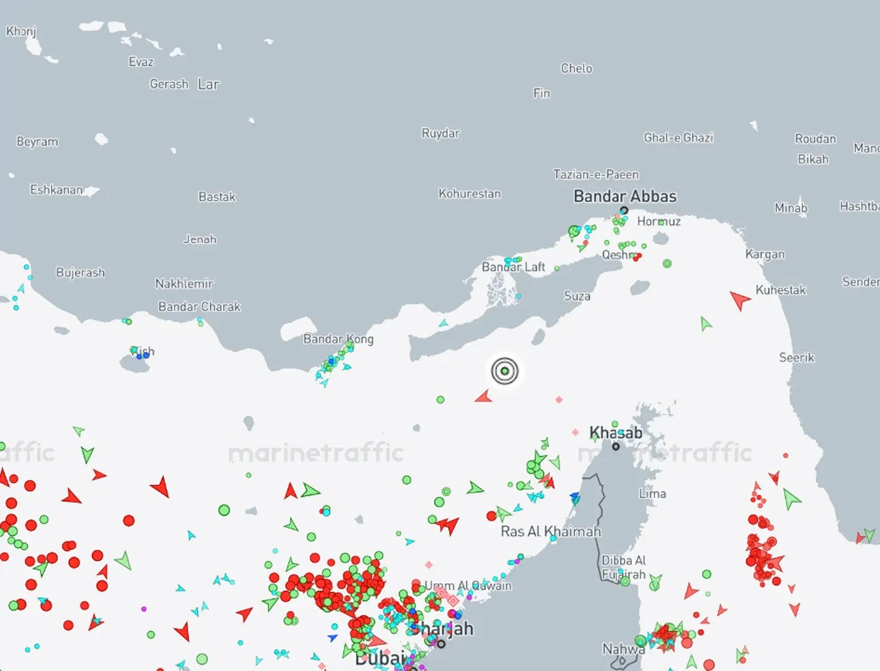 На текущий момент судно находится к югу от иранского острова Кешм. На фрагменте карты от популярного сервиса отслеживания судов обозначено кружком.