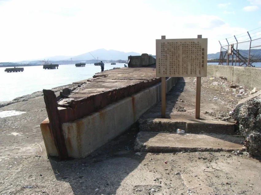 Корпус корабля «Янаги» с табличкой, на которой описана история волнолома, с «Сузуцуки» и «Фуюцуки», похороненными перед ним