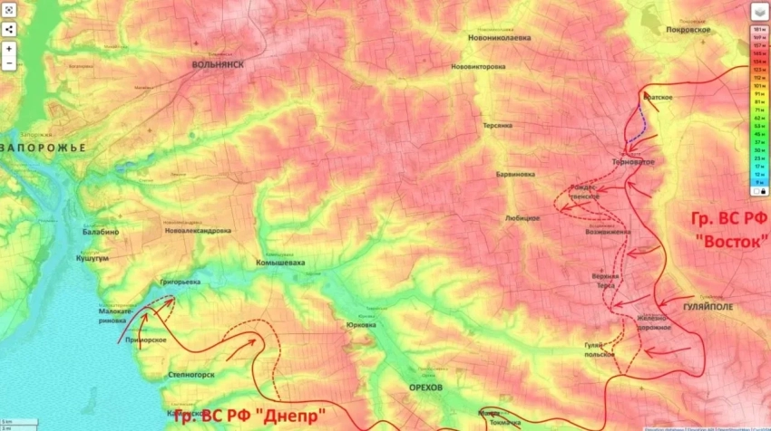 Бойцы армии Российской Федерации одновременно работают по двум направлениям. С одной стороны - занимаются окружением Ореховского укрепрайона, взаимодействуя с группировкой «Восток». С другой - совершают броски к южным окраинам Запорожья.