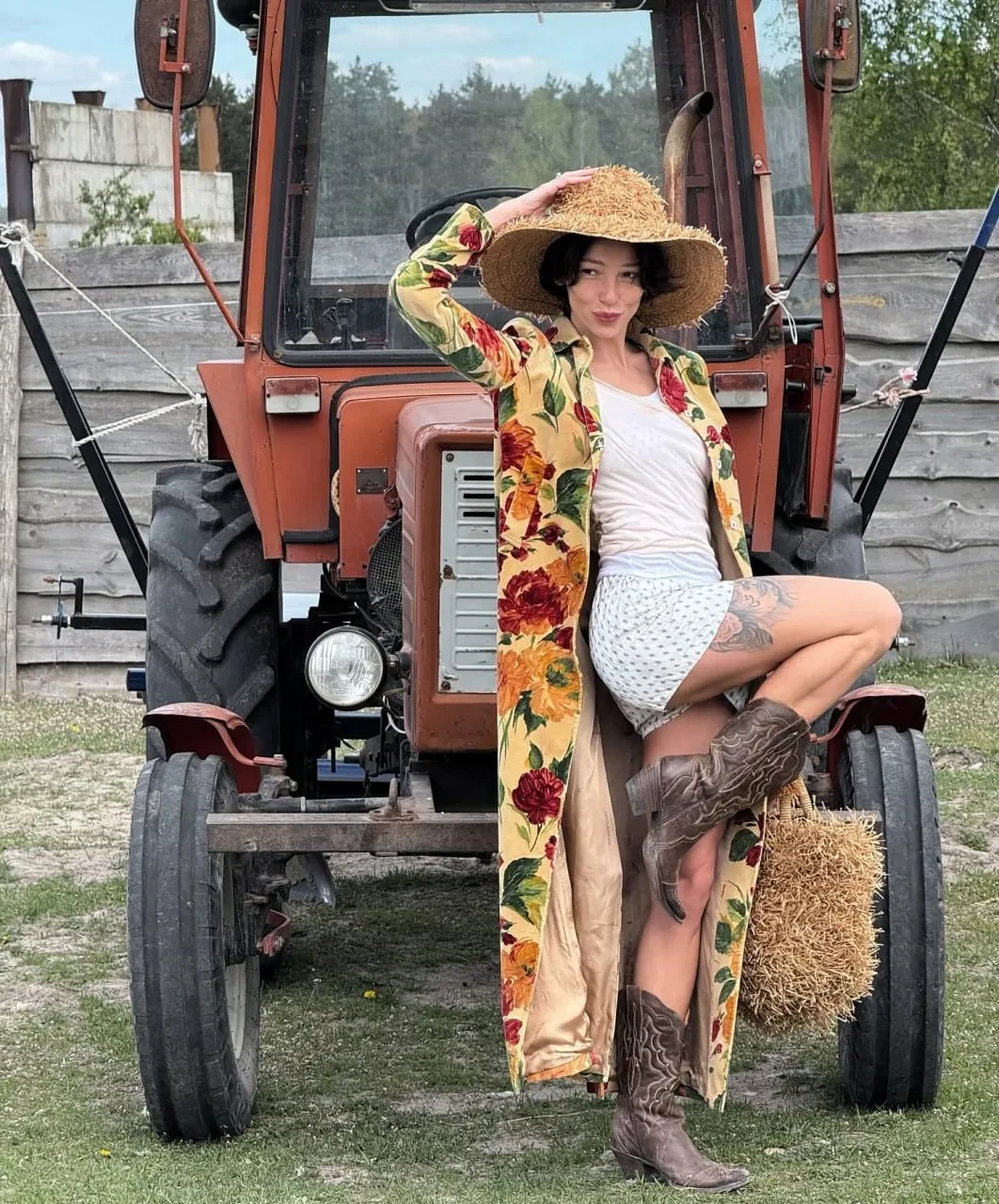 Так, на одном из снимков блогерша позирует, стоя перед трактором, а на другом — рядом с коровой.