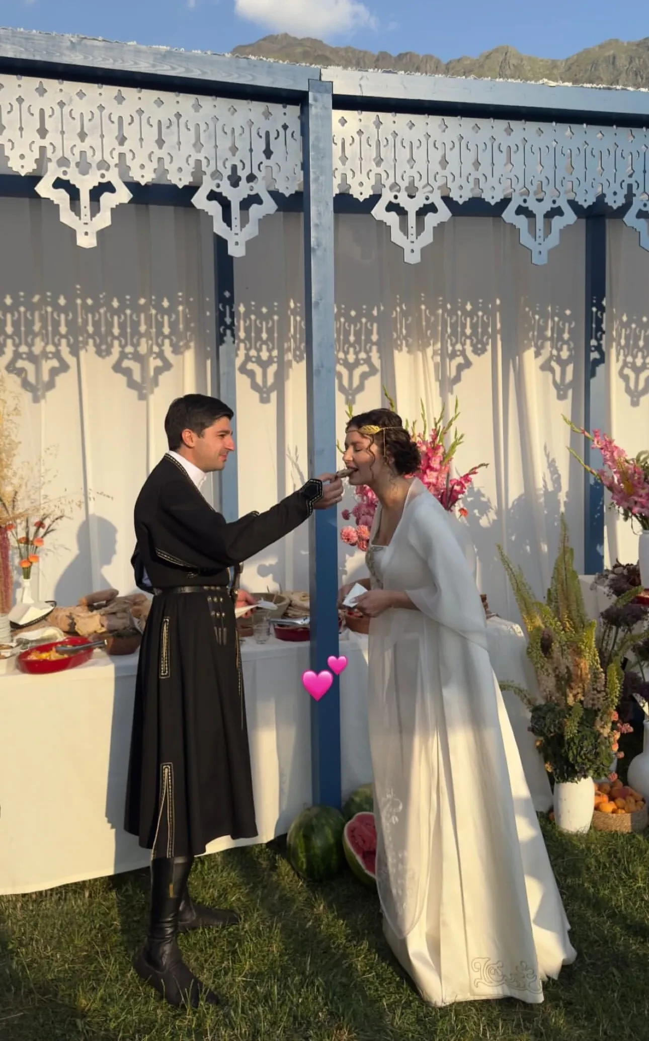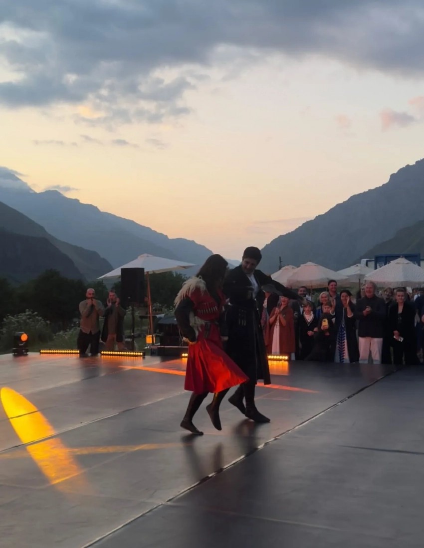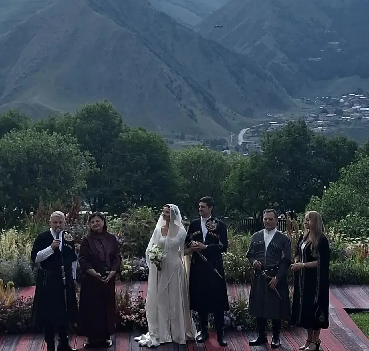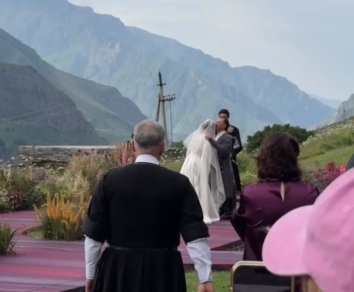 Традиционную грузинскую свадьбу отгуляли в отеле Rooms Kazbegi в Степанцминде, у подножья горы Казбек. Многочисленные родственники и друзья пары нарядились в национальные костюмы, наслаждались выступлениями местных артистов и народными танцами в исполнении жениха и невесты.