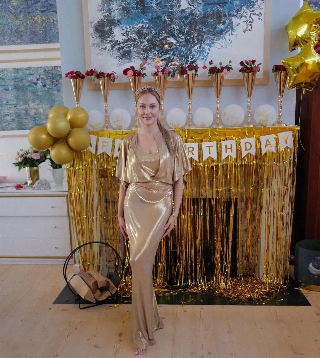Перед гостями Узерли появилась в платье, имитирующем жидкое золото, в таком же стиле был украшен её дом. Гости праздника, среди которых были её родители, старшая сестра и двое детей, также были в нарядах с золотистыми пайетками.