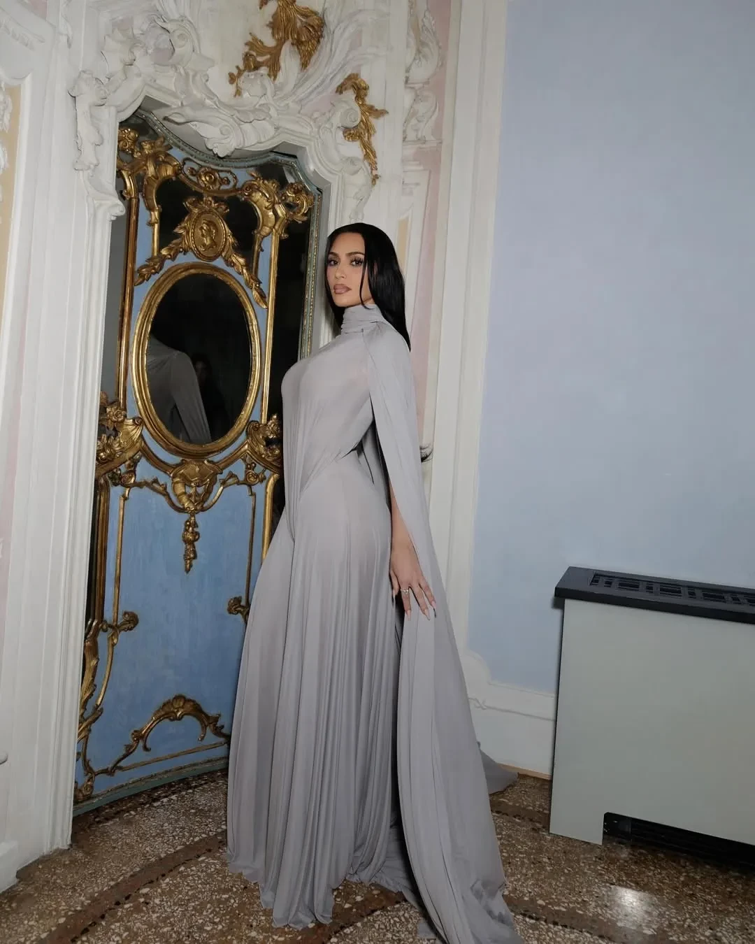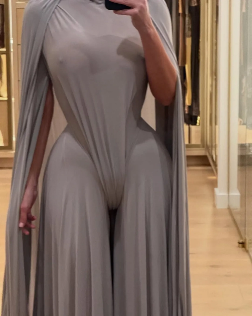 Дело в том, что 44-летняя телезвезда посетила премию в необычном сером наряде из дебютной кутюрной коллекции Гленна Мартенса для Maison Margiela. Драпированное платье-комбинезон отличается необычным силуэтом и тем, что предполагает отсутствие нижнего белья. Кардашьян, впрочем, не стала излишне эпатировать публику и надела под наряд бельё — непосредственно на мероприятие. Но и на голое тело комбинезон она также примерила и сделала селфи, которое опубликовала в своих соцсетях.
