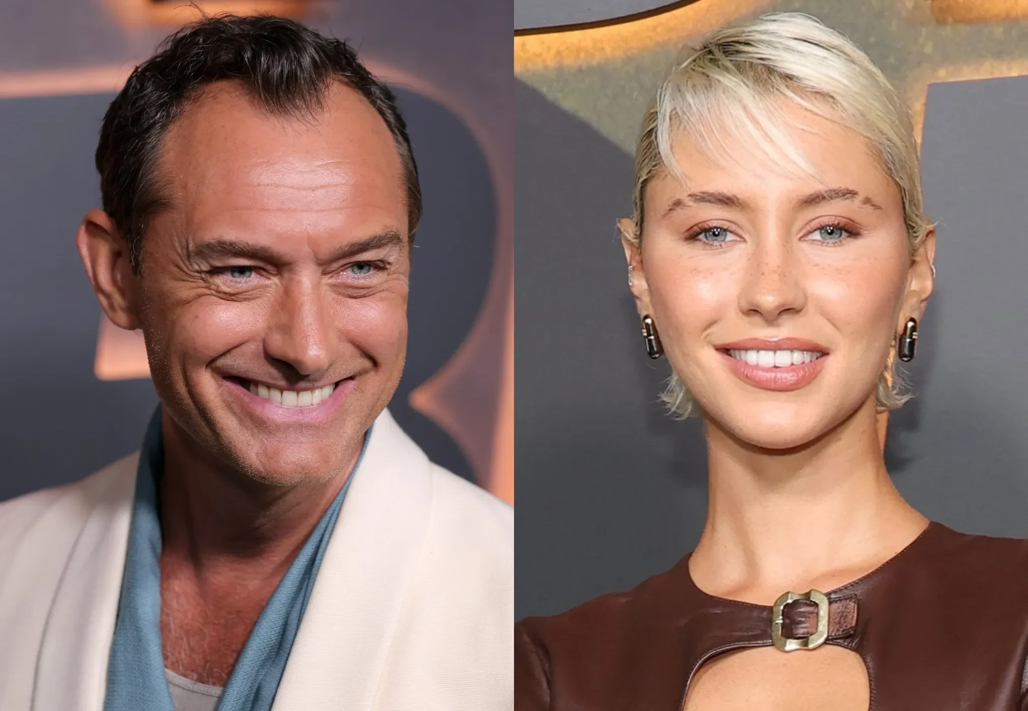 52-летний Джуд Лоу, который сыграл Владимира Путина в фильме "Кремлёвский волшебник", позировал на премьере в брючном костюме сливочного оттенка, а 24-летняя модель и инфлюенсер Айрис пришла в коричневом кожаном джемпере, юбке-карандаш горчичного цвета и туфлях Miu Miu.