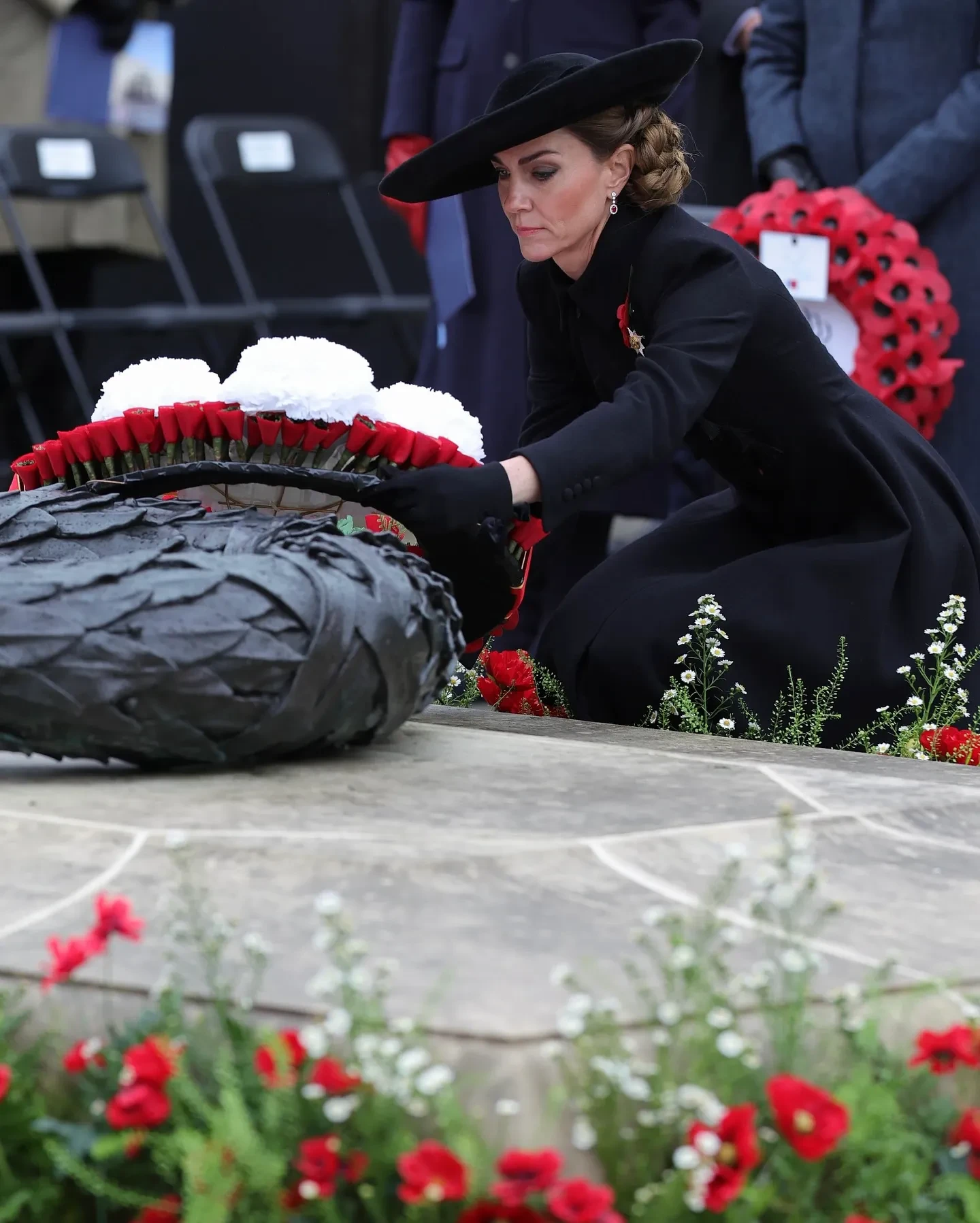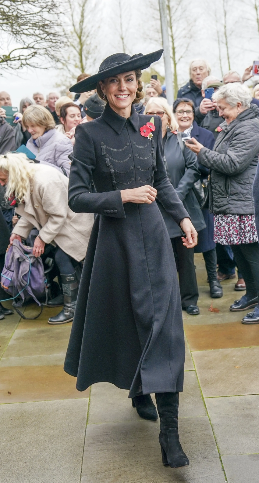 На мероприятии 43-летняя принцесса Уэльская появилась в чёрном платье-пальто от Catherine Walker. Образ она дополнила шляпой с широкими полями от Jane Taylor, короткими перчатками и сапогами на каблуке от Gianvito Rossi. Из украшений Кейт выбрала серьги с бриллиантами и рубинами, брошь Ирландской гвардии и традиционный красный мак.