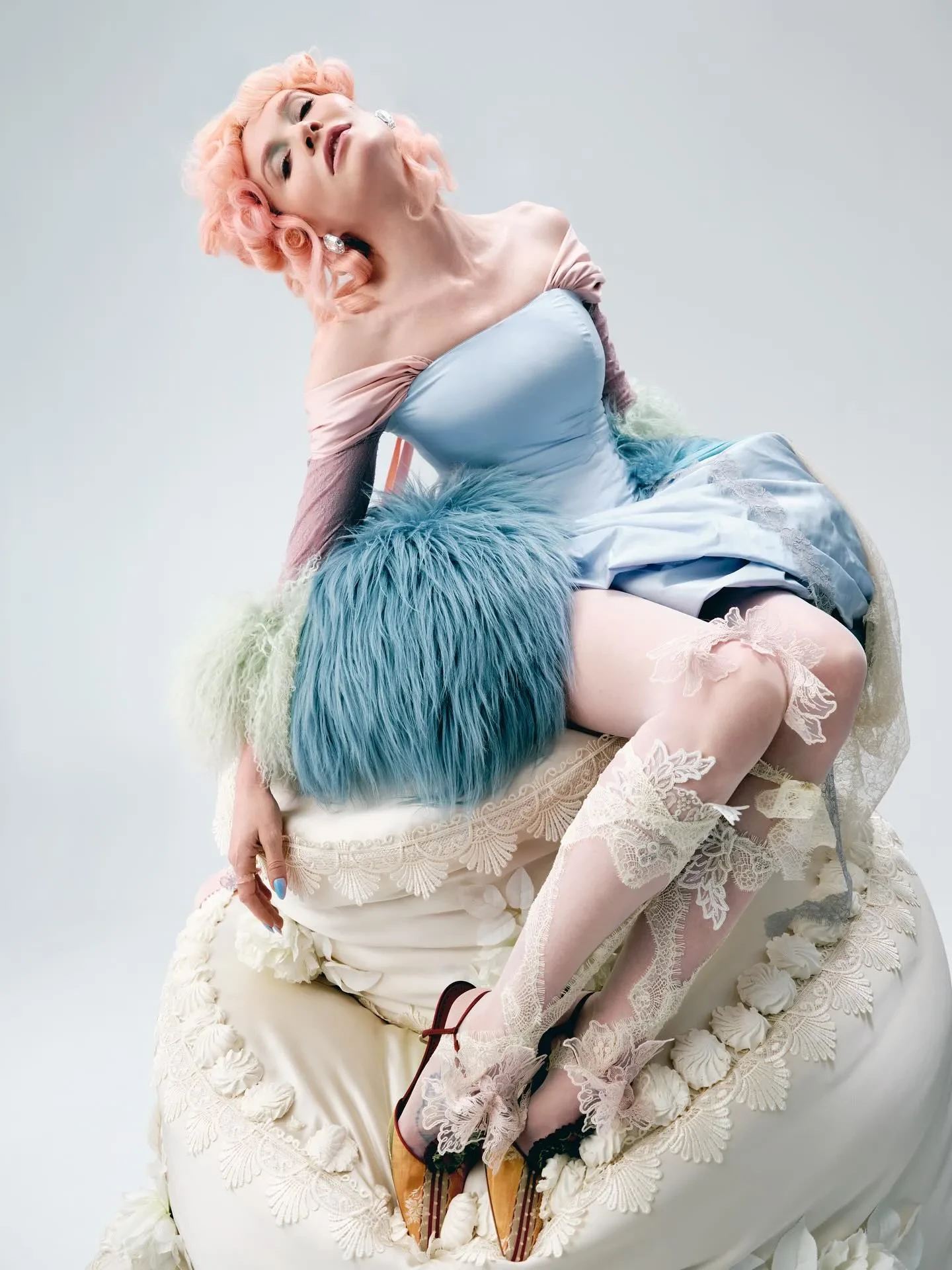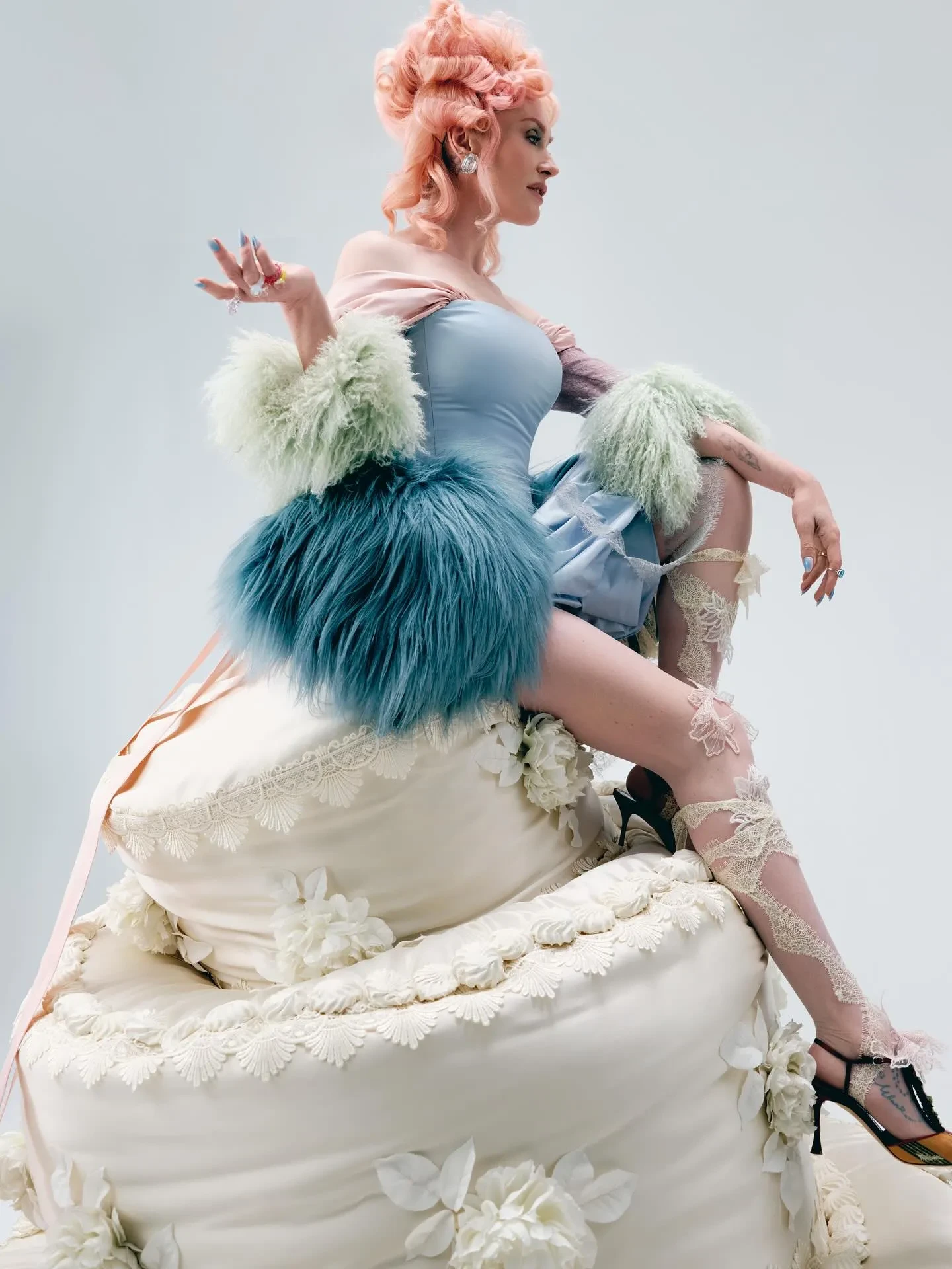 На фото Давыдова позирует на фоне большого декоративного торта. На ней голубое винтажное платье, полупрозрачные кружевные чулки и туфли на каблуке. Образ дополняют массивные украшения и узнаваемая высокая причёска с розовыми локонами. "С днём рождения меня", — подписала публикацию Наталья.