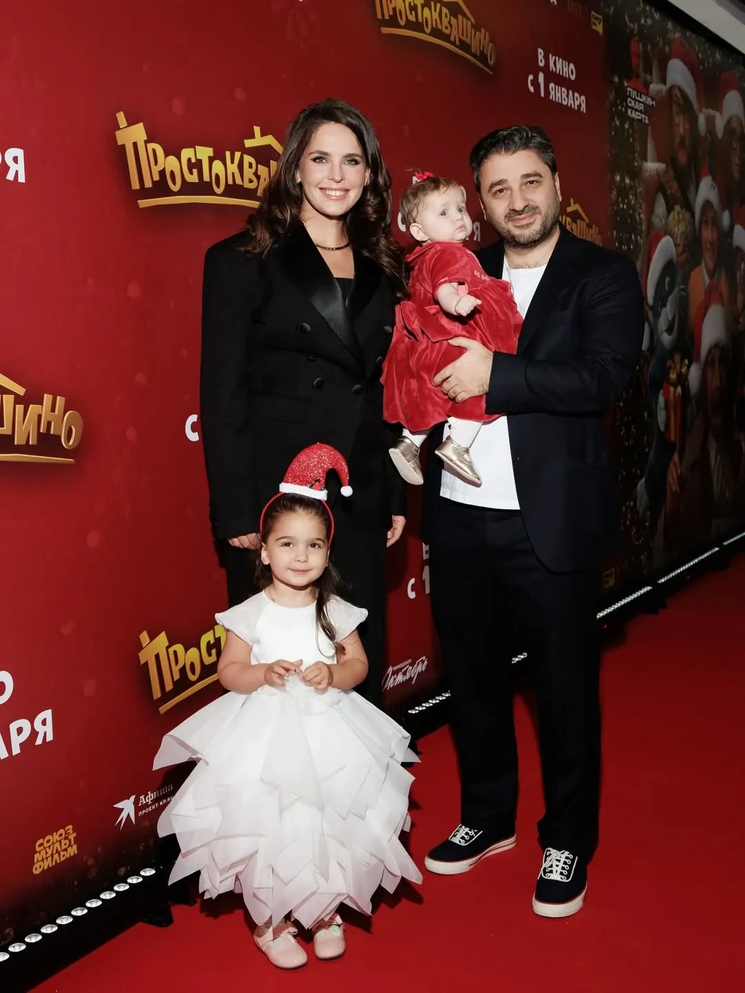 Тина Канделаки, Павел Прилучный, Иван Охлобыстин и Лиза Моряк с дочерьми на премьере фильма "Простоквашино"