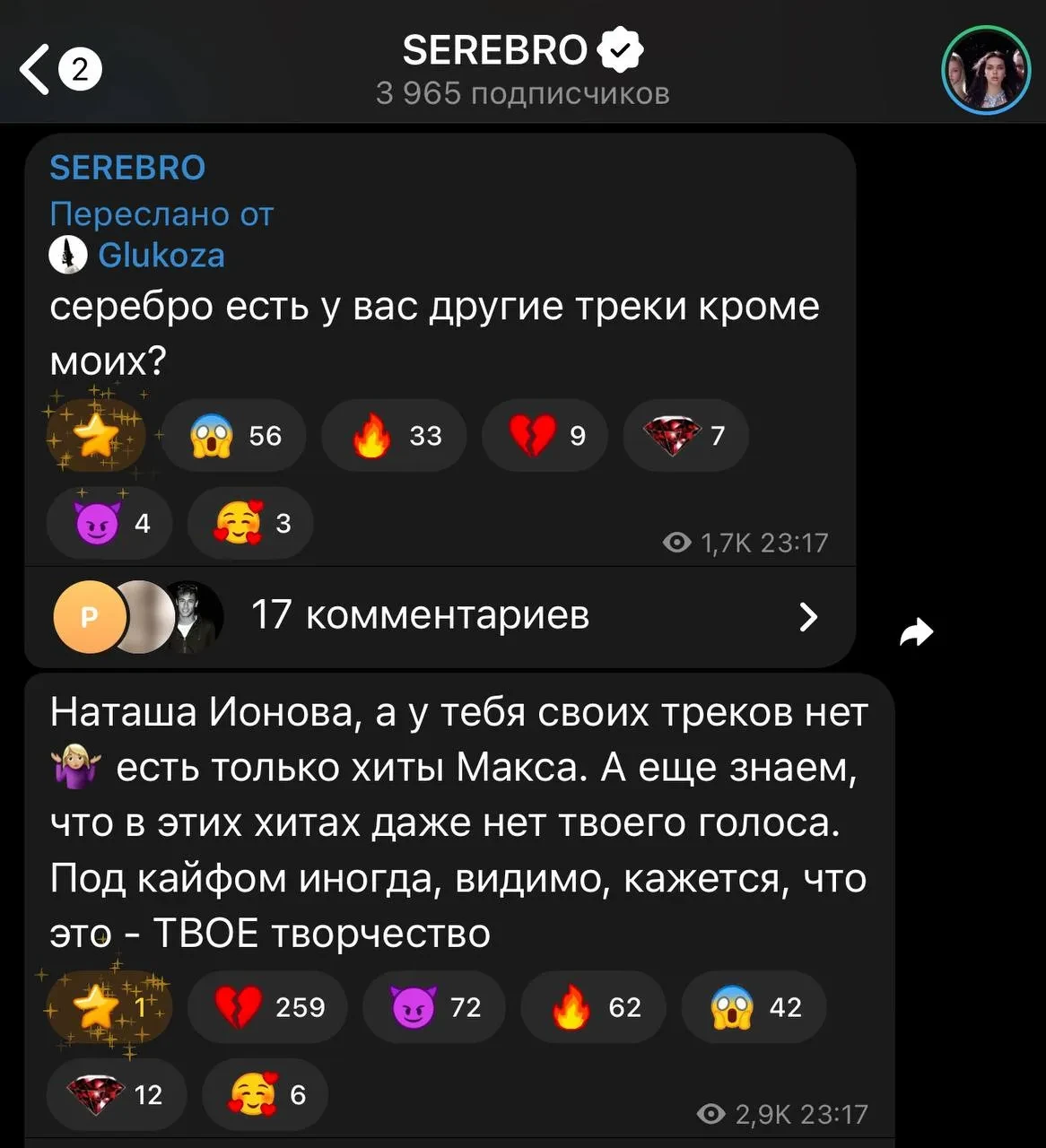 Телеграм-канал "Серебра"Ответ группы не заставил себя ждать. Участницы напомнили, что права на песню принадлежат не Глюкозе, а также резко высказались о самой Ионовой, упомянув её недавний скандал: "Наташа Ионова, а у тебя своих треков нет. Есть только хиты Макса. А ещё знаем, что в этих хитах даже нет твоего голоса. Под кайфом иногда, видимо, кажется, что это — твоё творчество".