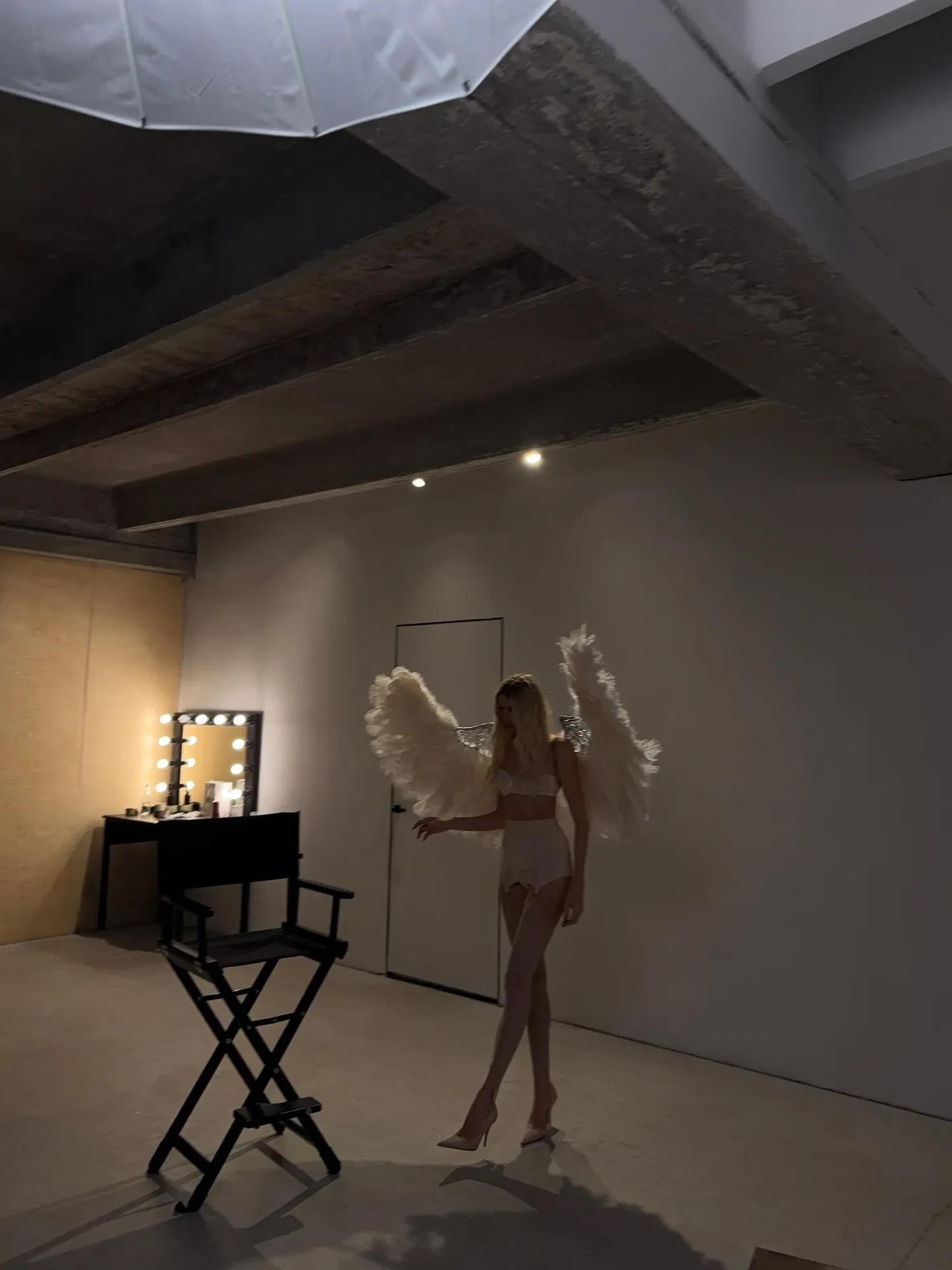 Для съёмки Перминова примерила белый кружевной комплект нижнего белья. Образ завершили туфли на шпильке и массивные ангельские крылья в тон наряду.