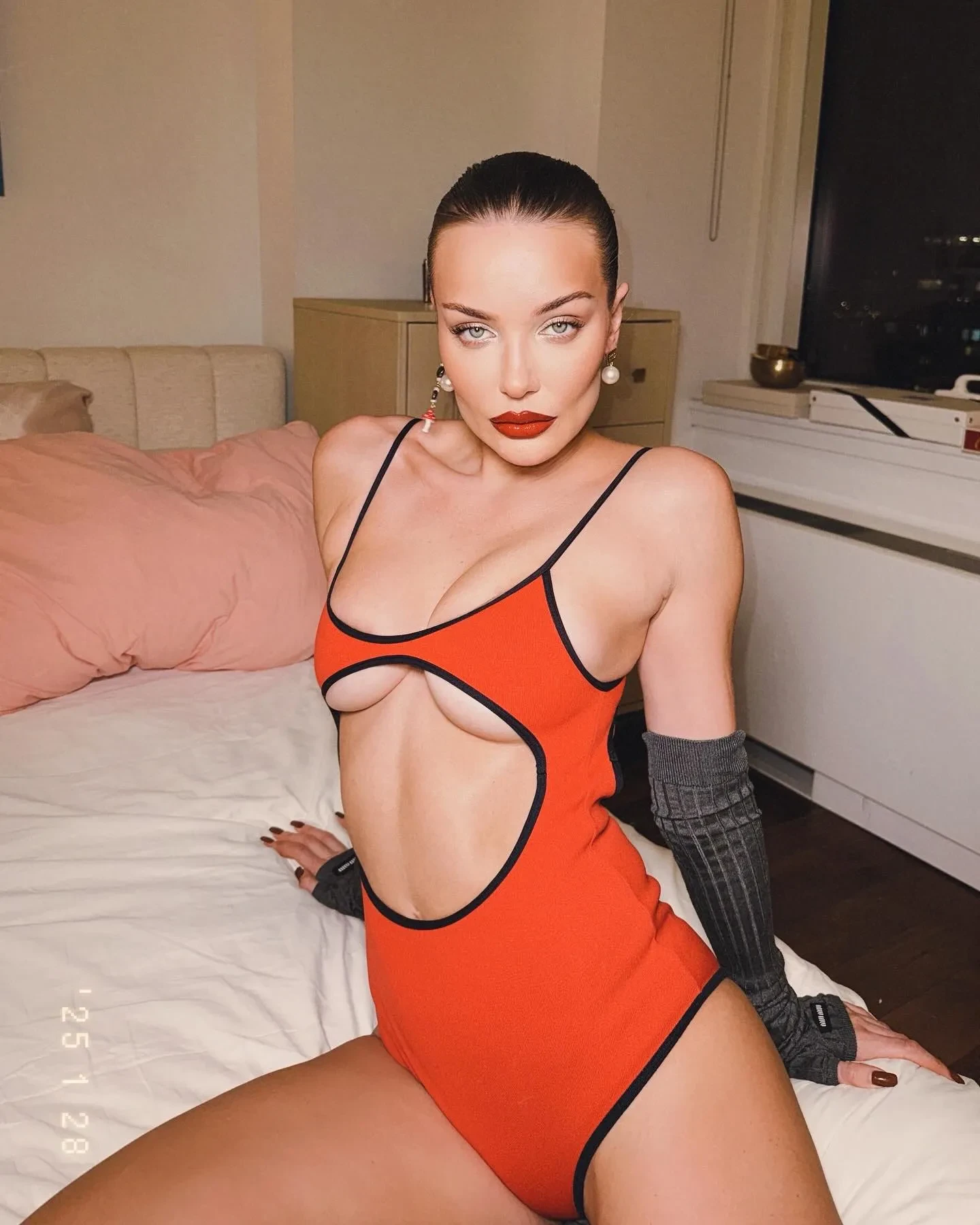 На снимке Коновалова сидит на бортике ложи в позе лотоса, предварительно сняв обувь. Для похода в театр она выбрала чёрный топ с глубоким декольте и красную мини-юбку. В подписи к фото 37-летняя модель написала: "Russia stay strong. Love you" ("Россия, оставайся сильной. Люблю тебя").