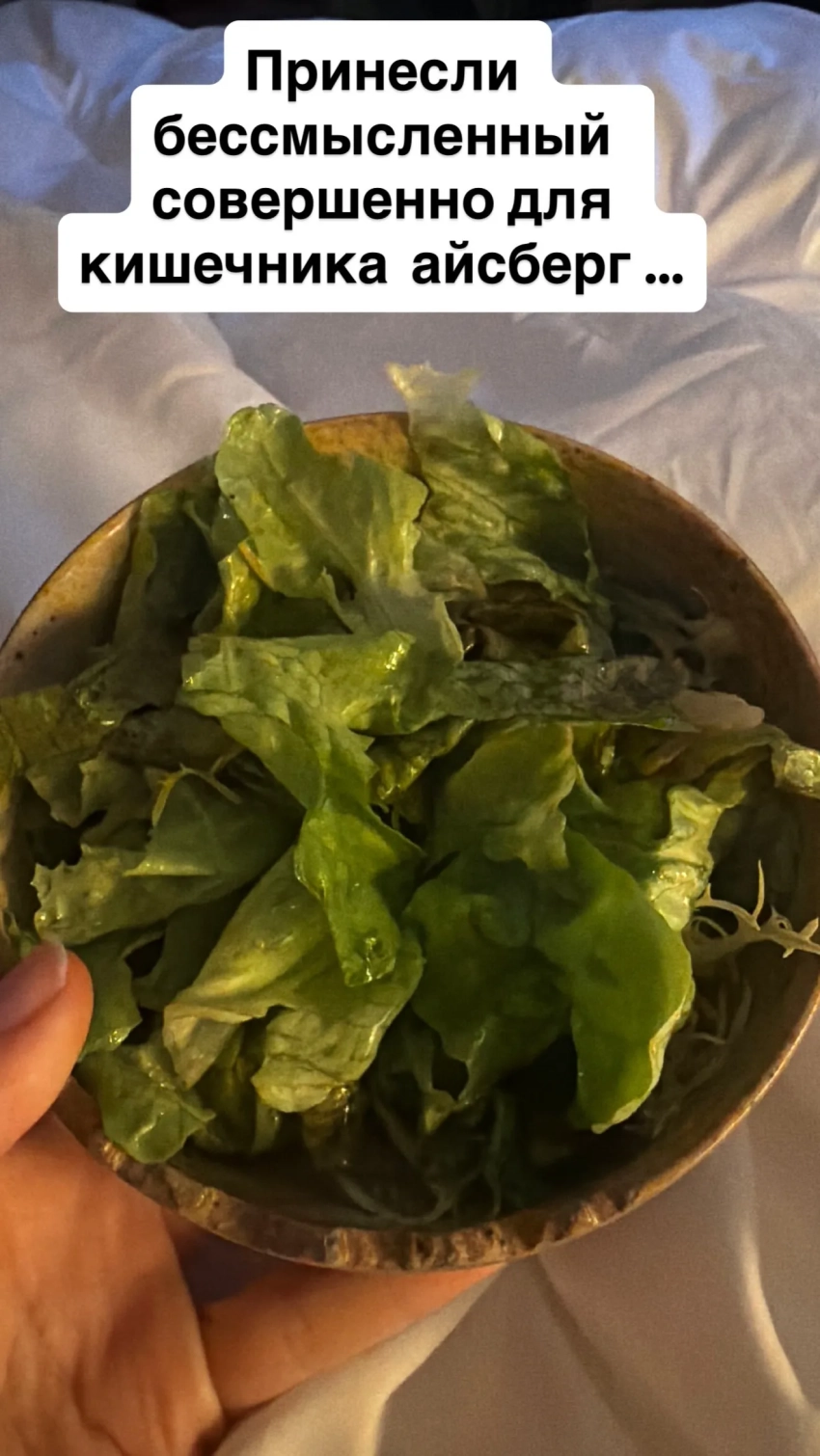 Скриншот из сторис* Ксении СобчакСкриншот из сторис* Ксении СобчакСобчак высказалась и по поводу питания в пятизвёздочном отеле. Помощник звезды пытался заказать ей "зелёный сок" из определённых ингредиентов (зелёные яблоки, огурец, сельдерей, имбирь, петрушка и шпинат), а также два варёных яйца, тарелку зелени и капучино, но в итоге Ксении пришлось есть салат "Айсберг". "Даже мой ассистент уже не выдерживает. Попросили мою традиционную траву на завтрак".