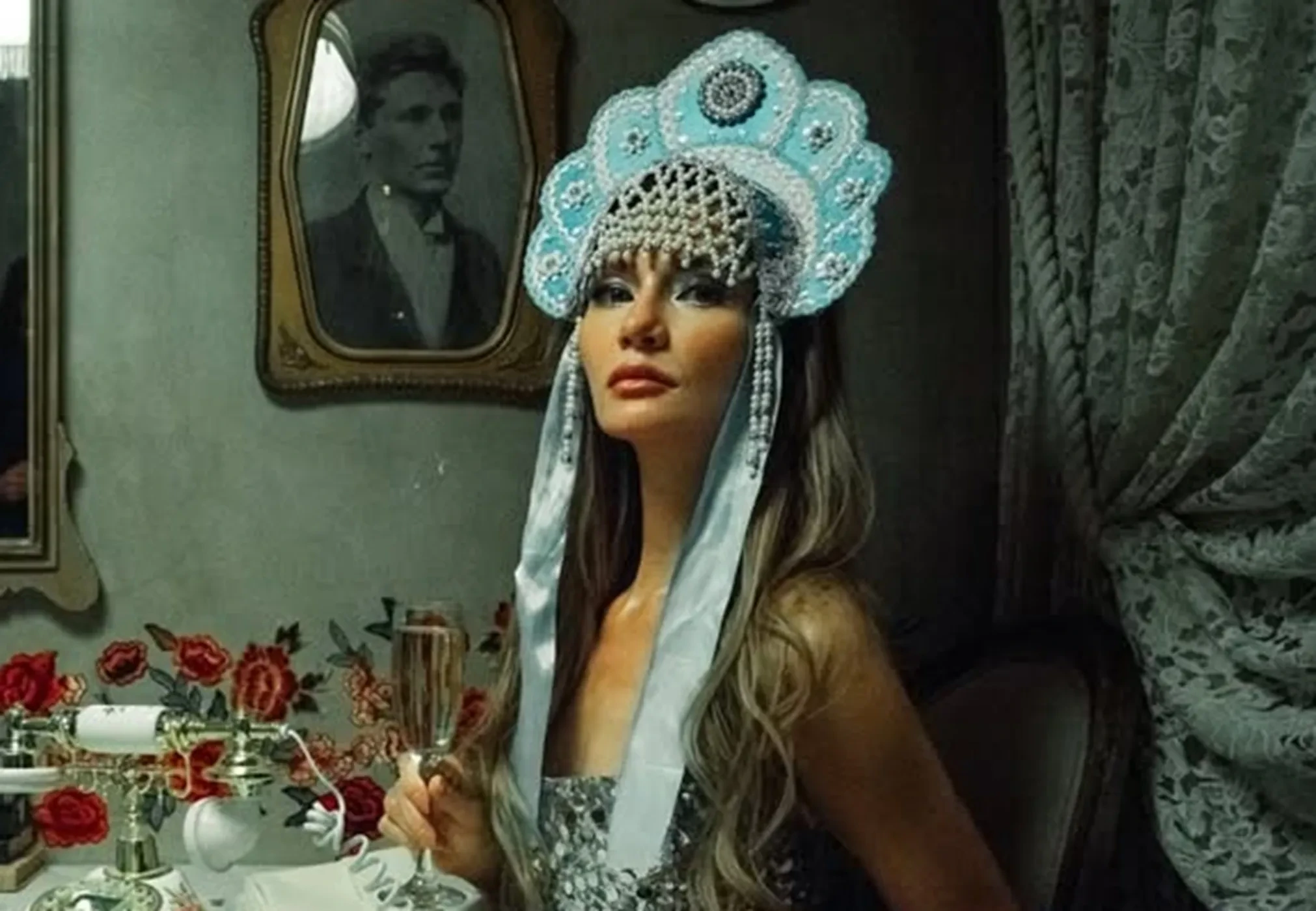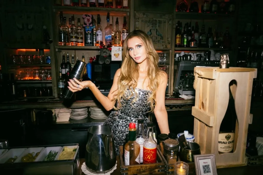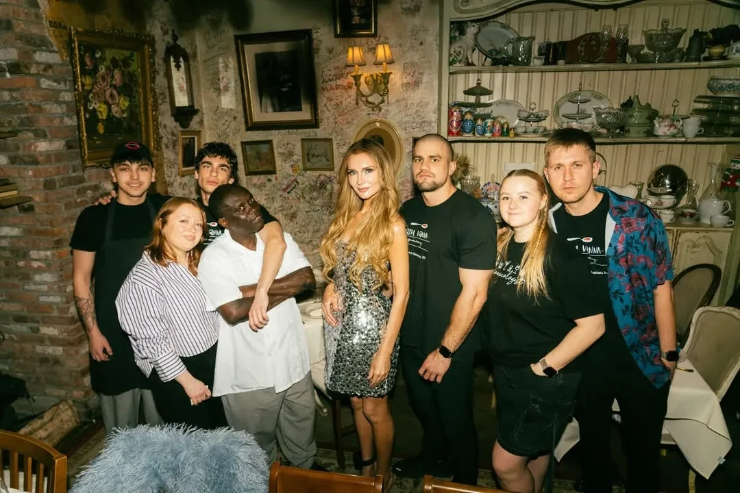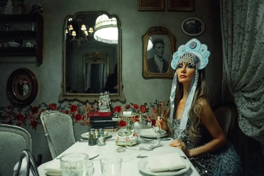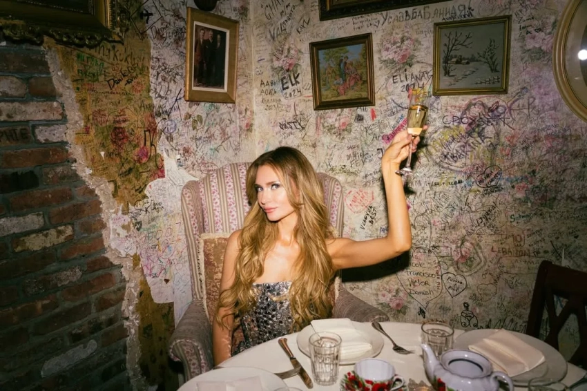 Вечер прошёл в ресторане известной сети "Мари Vanna", концепция которого полностью построена на русской культуре и ностальгии. Для фото Делви попозировала в кокошнике и не фоне полок с матрёшками.