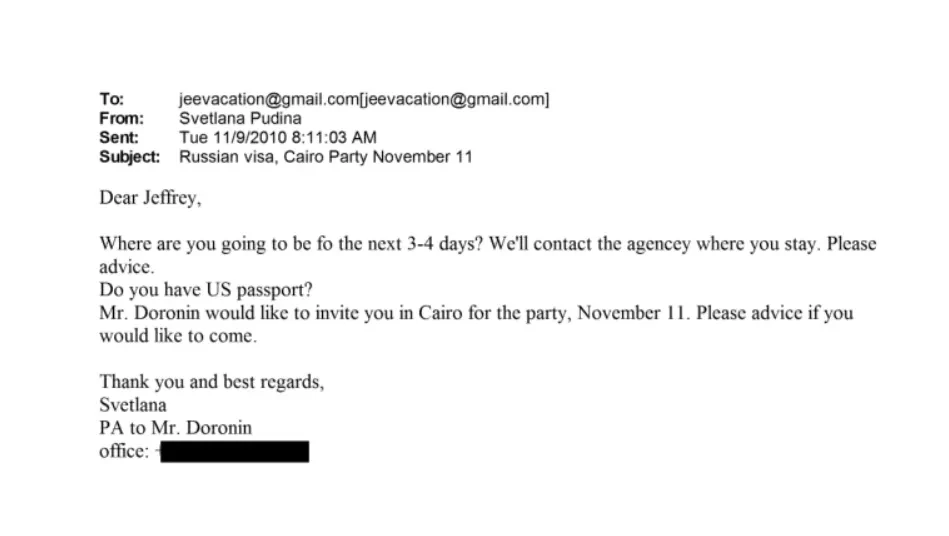 Согласно документам, в 2010 году Доронин приглашал Эпштейна на свою вечеринку в Каире, а также на празднование 40-летия Кэмпбелл в Каннах. В переписке, помимо светских приглашений, содержатся и более личные сообщения. Например, Доронин предлагал финансисту помощь в получении российской визы. Для упрощения процедуры, по письмам, Эпштейн должен был представиться личным гостем бизнесмена. Более того, по просьбе Наоми Кэмпбелл, помощники Доронина предлагали Джеффри остановиться в одном из апартаментных комплексов, построенных компанией миллиардера в центре Москвы.