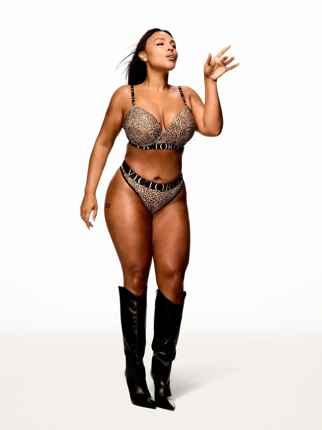 44-летняя Адриана Лима позировала в нескольких комплектах и сапогах на каблуках. Компанию ей составила ещё одна из давних "ангелов" бренда, 37-летняя Кэндис Свейнпол. Она примерила чёрное и леопардовое бельё.