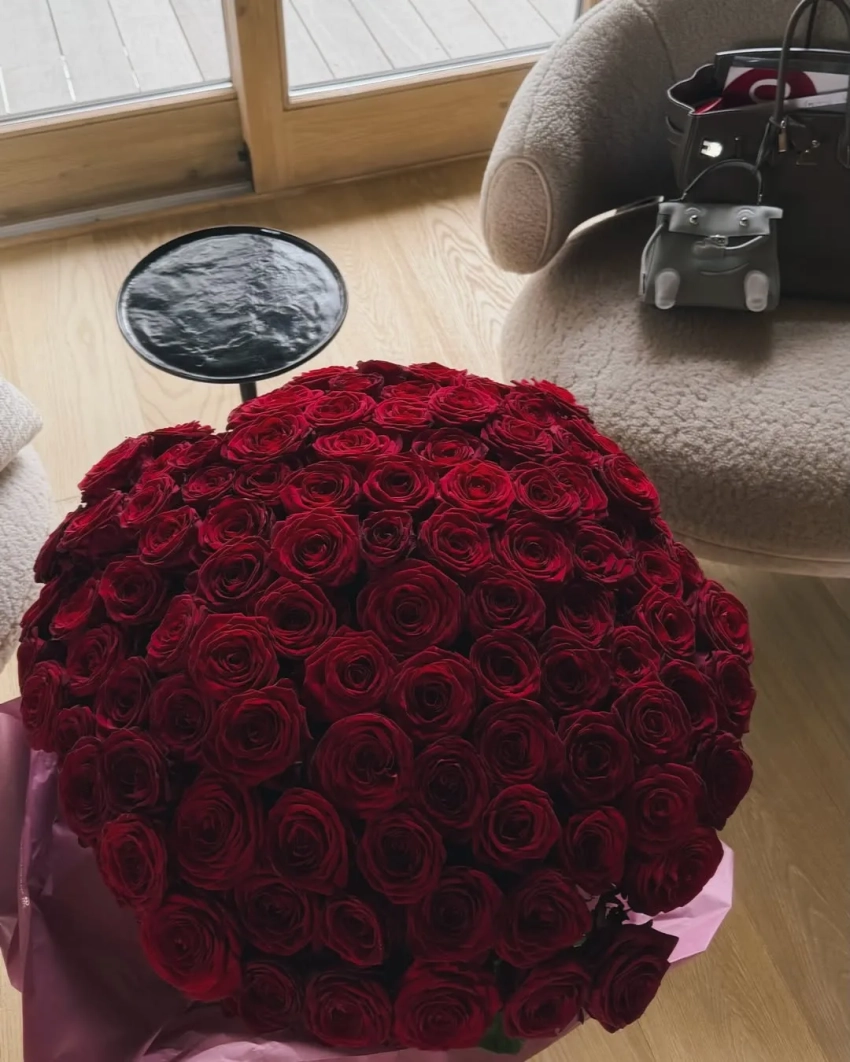 На фото Романова и Доронин позируют перед ужином в ресторане. В честь праздника модель надела короткое чёрное платье, золотой браслет, украшения с бриллиантами и шубу, дополнив образ красной помадой и сумкой Hermes. Она также показала интерьер отеля, в котором остановилась пара, фото в горнолыжных костюмах, праздничный стол с чёрной икрой и подарок от возлюбленного — большой букет красных роз.