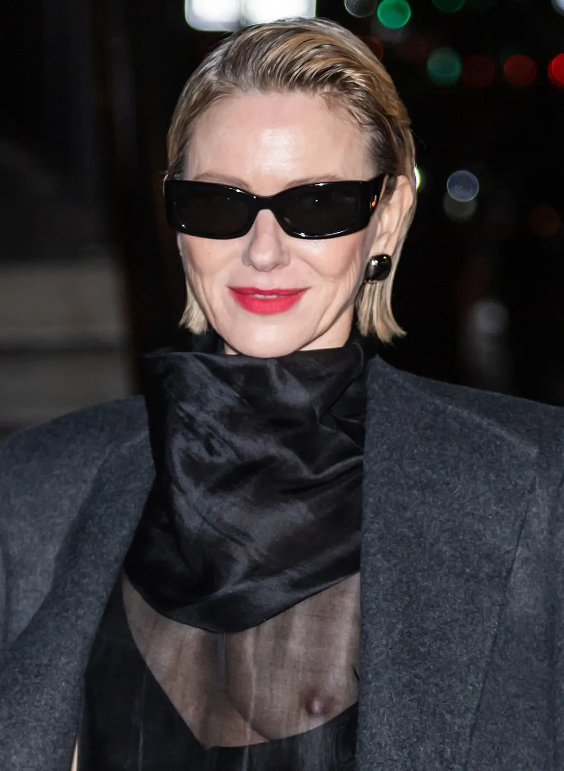 57-летняя актриса появилась на публике в чёрном платье, обнажив грудь, и сером пальто. Образ дополнили солнцезащитные очки и красная помада.
