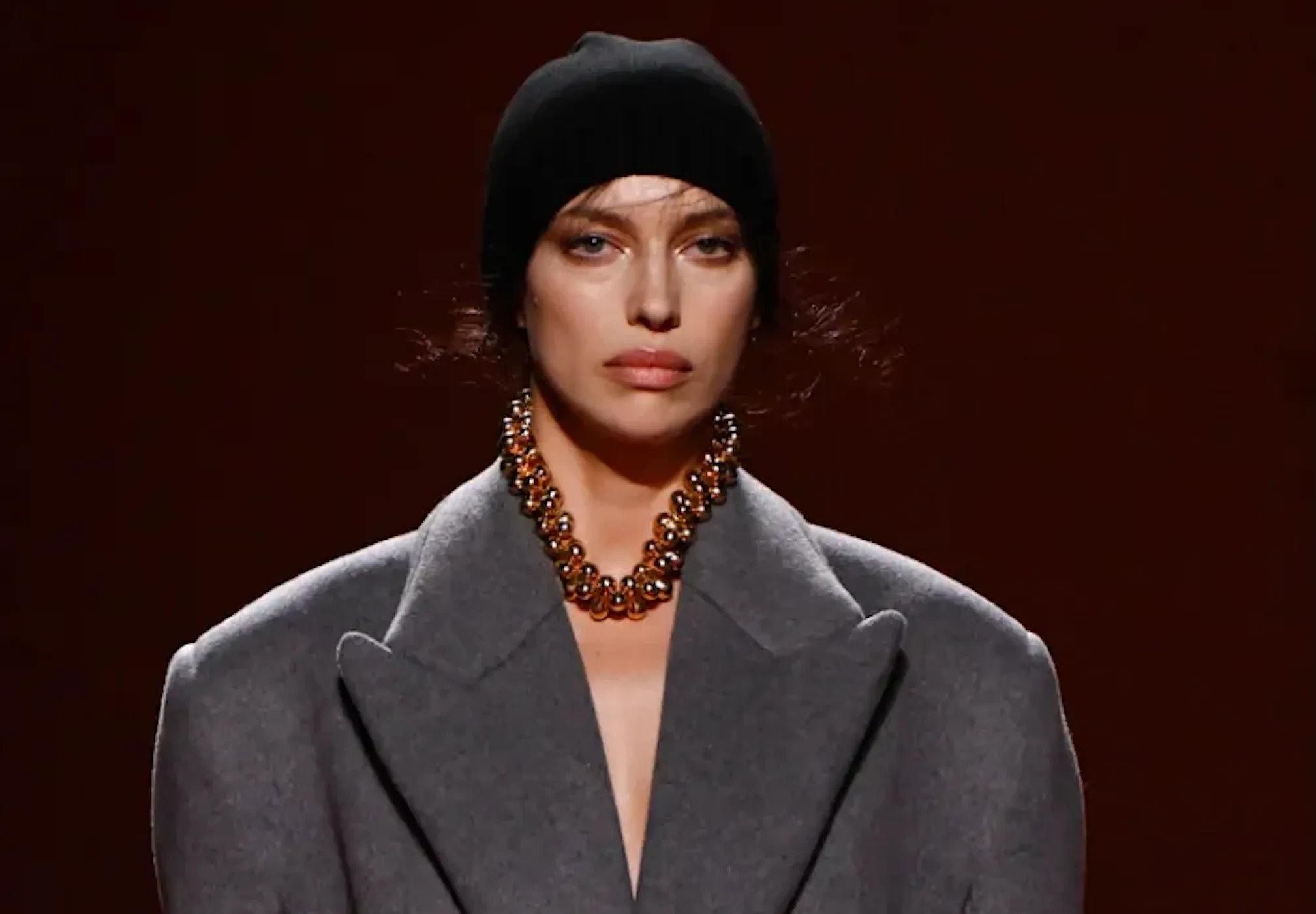 Ирина Шейк, которая на днях выступила соведущей на фестивале в Сан-Ремо, приняла участие в Неделе моды в Милане. 40-летняя супермодель прошлась по подиуму на показе новой коллекции Bottega Veneta. Она вышла на подиум в сером пальто на "голое тело", чёрной шапке и с золотой цепью на шее.