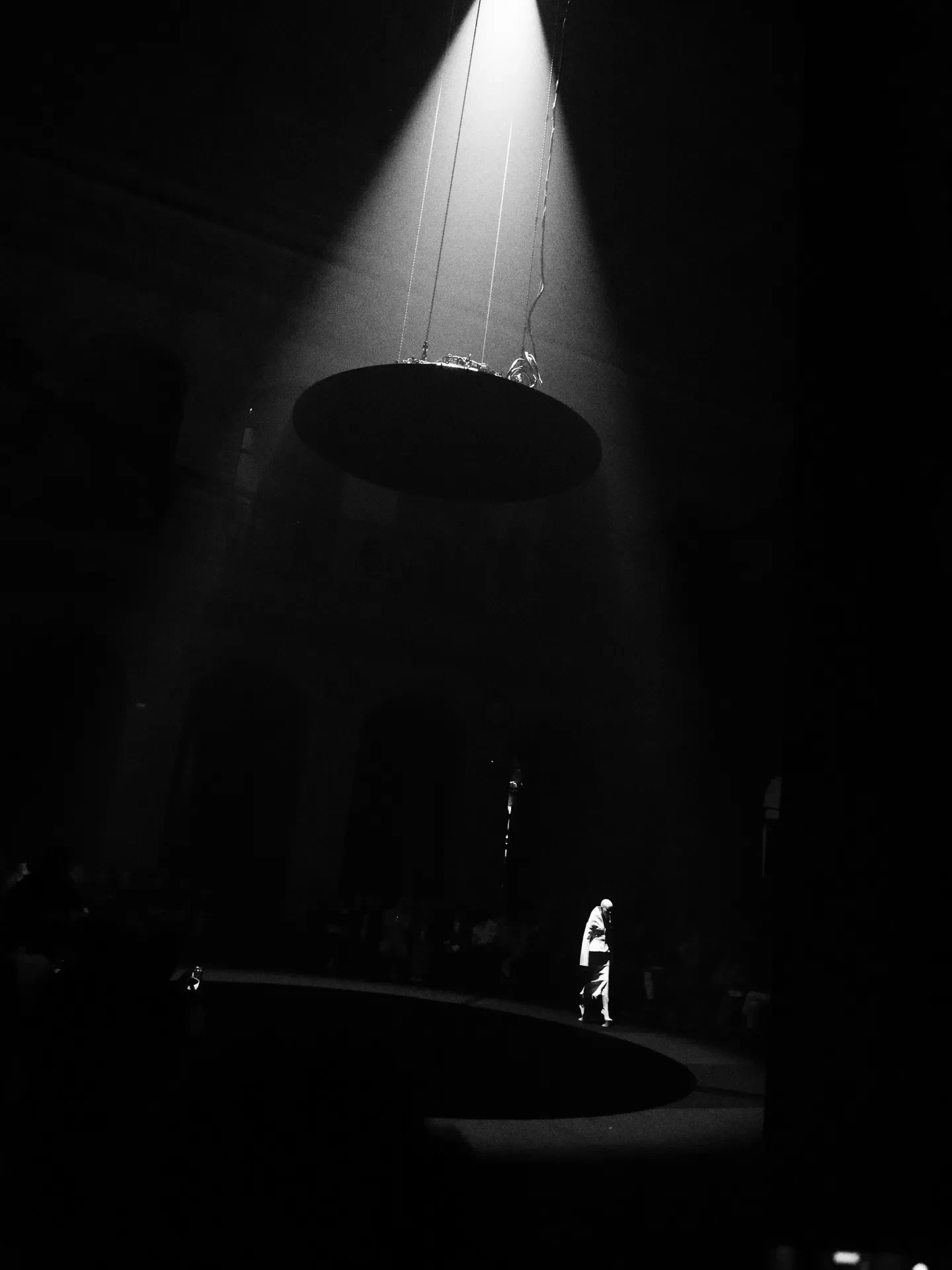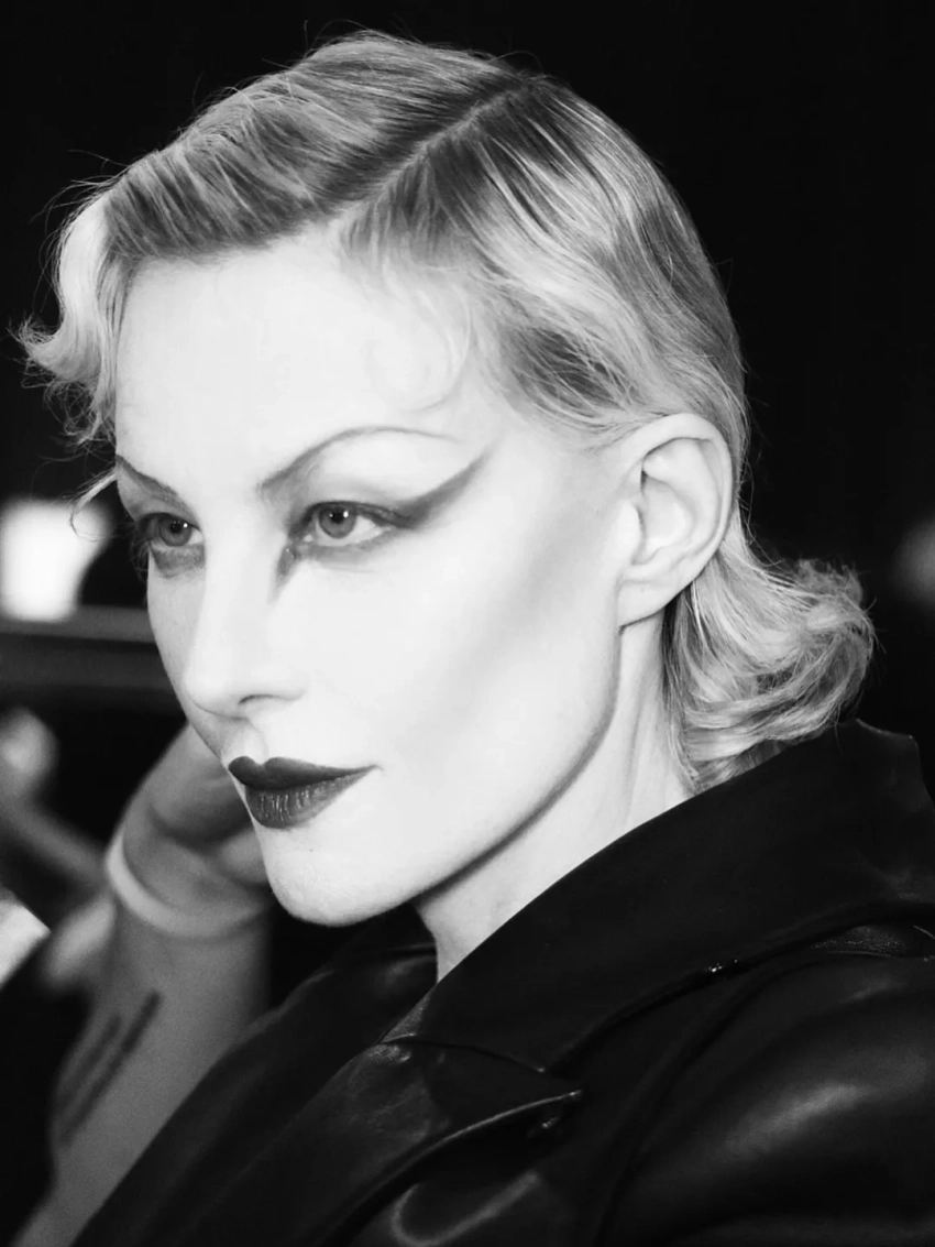 Рената дефилировала в чёрном кожаном жакете с объёмными плечами и плиссированной длинной юбке. Образ дополняли сапоги и перчатки, а финальным штрихом стал макияж в готическом стиле с длинными стрелками и алыми губами.