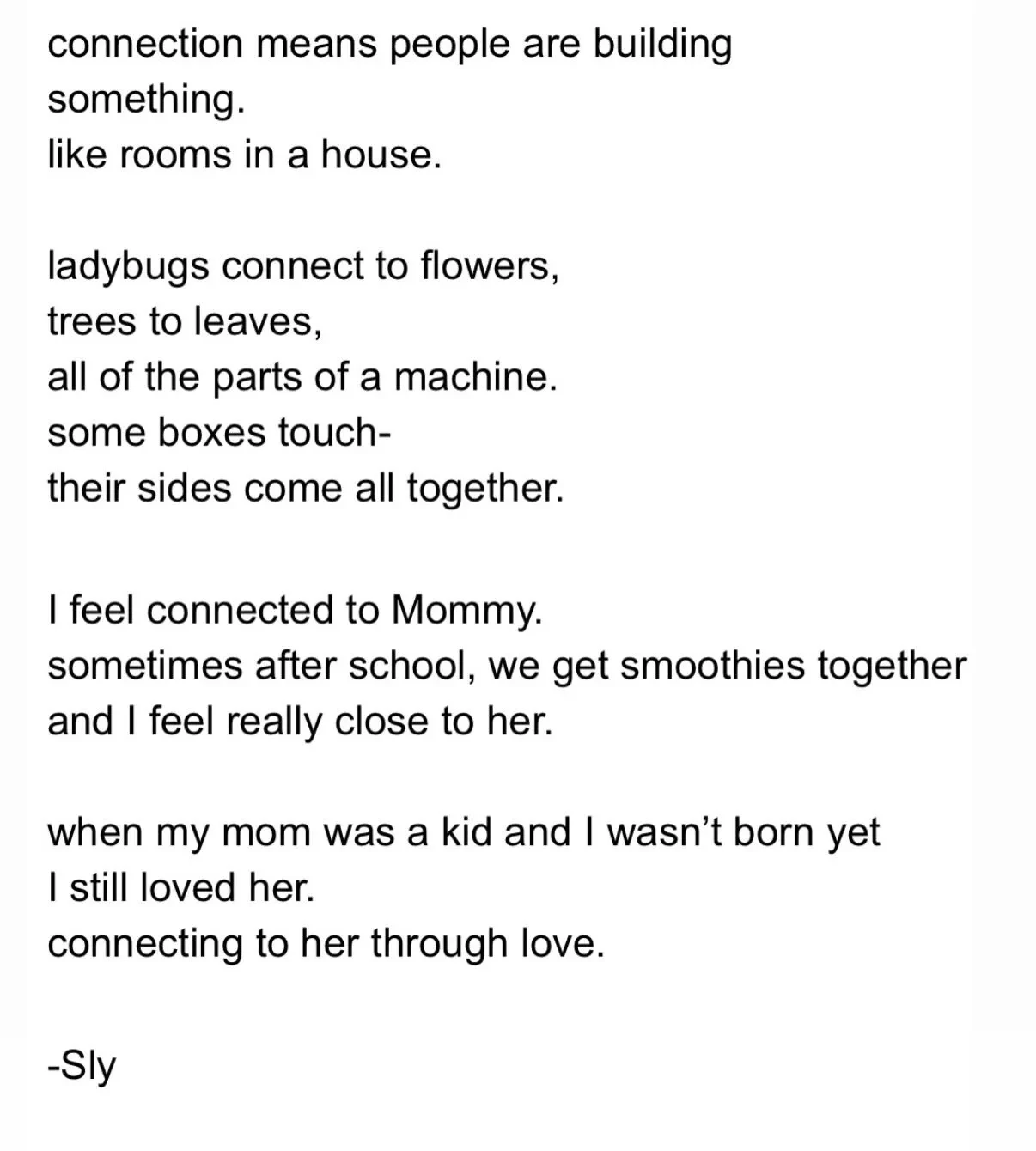 "Связь означает, что люди что-то создают. Например, комнаты в доме. У божьих коровок есть связь с цветами, у деревьев — с листьями. Всё это части одной системы. Некоторые коробки соприкасаются, и их стороны идеально совпадают. Я чувствую связь с мамой. Иногда после школы мы вместе идём пить смузи, и я ощущаю близость с ней. Когда моя мама была ребёнком, а я ещё не родился, я уже любил её. Я связываюсь с ней через любовь".