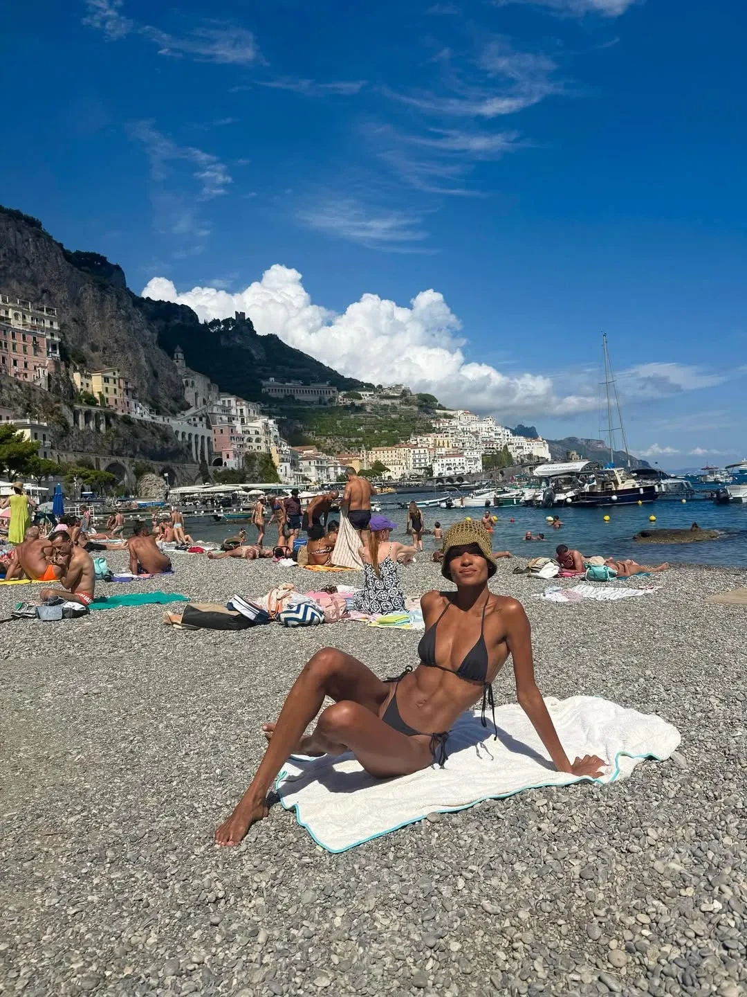 На снимках 29-летняя Нара Баптиста и французский актёр отдыхают с ребёнком на берегу океана. Модель позировала возлюбленному на камеру в бикини, пока их сын находился неподалёку. Позже семью также видели во время купания.