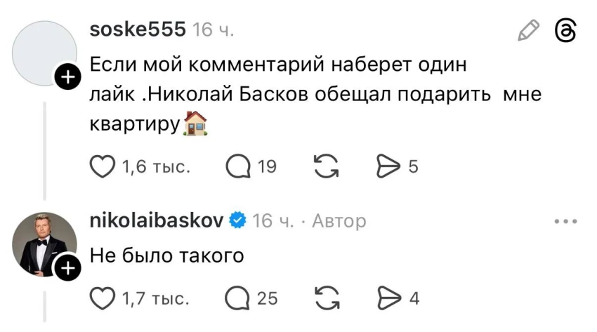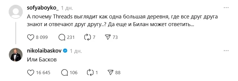Всю последнюю неделю пользователи Threads* удивляются неожиданной активности отечественных звёзд в этой соцсети. В частности, за "захватом" запрещённого на территории РФ сервиса стоят Дима Билан, Николай Басков и Григорий Лепс. Теперь в сети шутят, что некогда пустующая платформа превратилась в филиал "Золотого граммофона", а к вирусному тренду присоединяется всё больше селебрити.