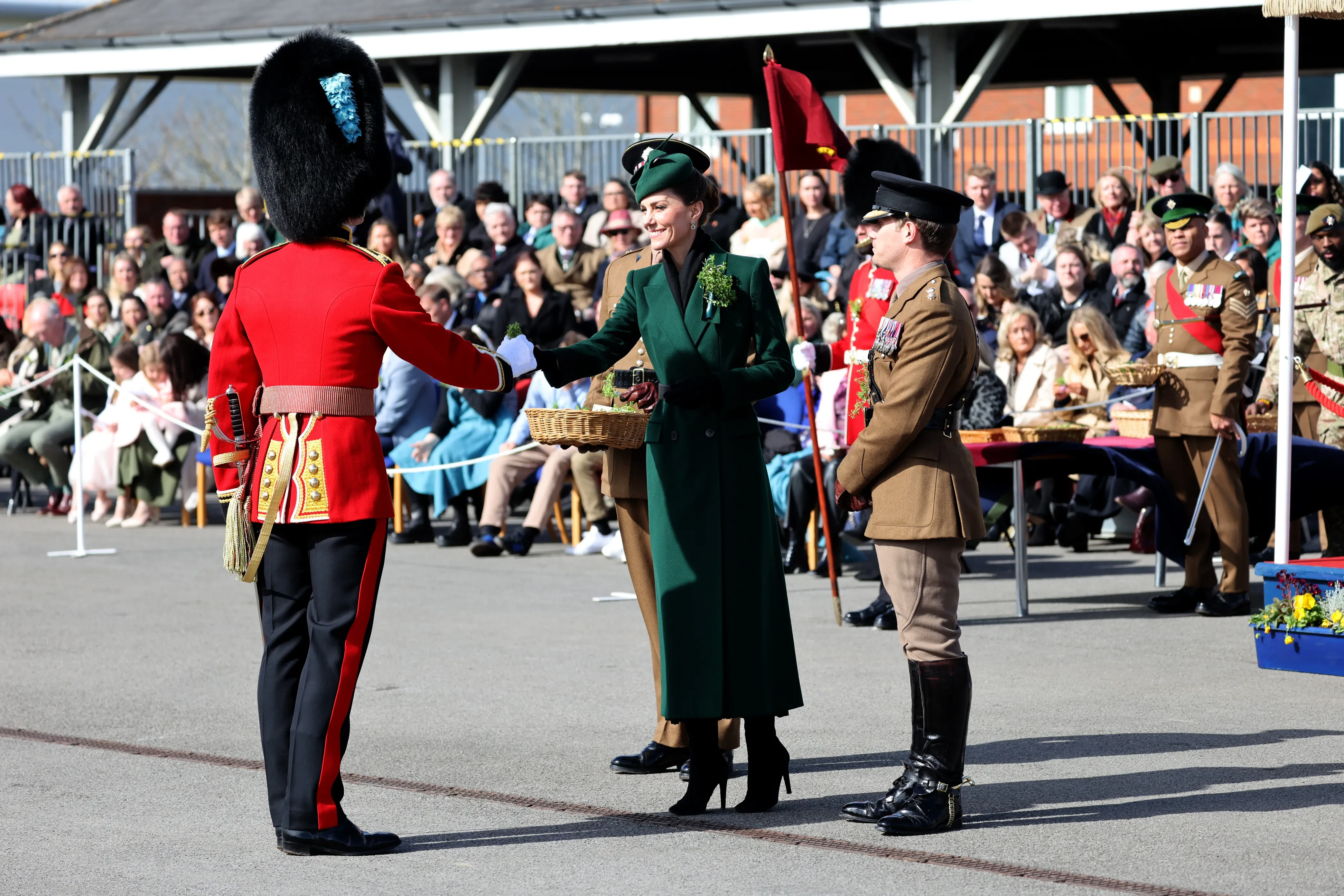 Как и в прошлом году, принцесса присутствовала на параде одна, без принца Уильяма (с 2022 года Кейт является почётным полковником Ирландской гвардии, переняв эту роль у мужа, поэтому парад теперь считается её персональным рабочим мероприятием). Она вручила традиционные веточки клевера (трилистники) офицерам и гвардейцам и приняла королевский салют от военнослужащих.