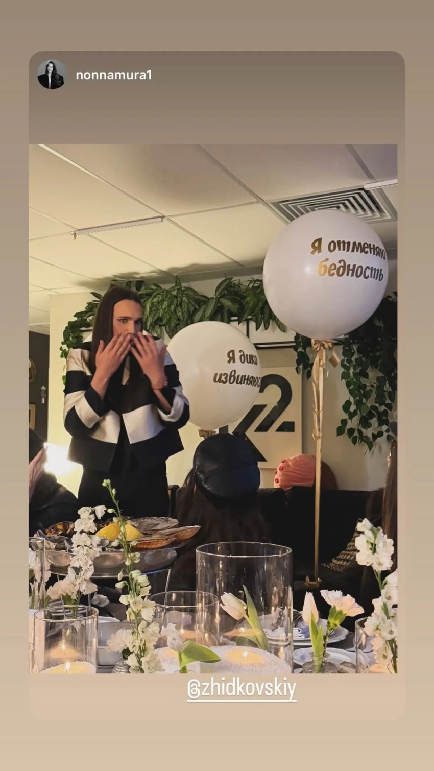 Популярному блогеру Алексею Жидковскому накануне исполнилось 30 лет, и его друзья устроили вечеринку-сюрприз в честь этого события. Гости нарядились в стиле именинника и надели маски с его изображением, виновнику торжества вынесли торт со свечами в виде сумки Michael Kors.