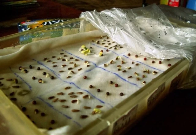 Самый доступный способ. Семена заворачивают во влажную ткань или марлю, помещают в неглубокую емкость и следят, чтобы ткань не пересыхала . Вода должна быть комнатной температуры, лучше талая или хотя бы отстоянная .