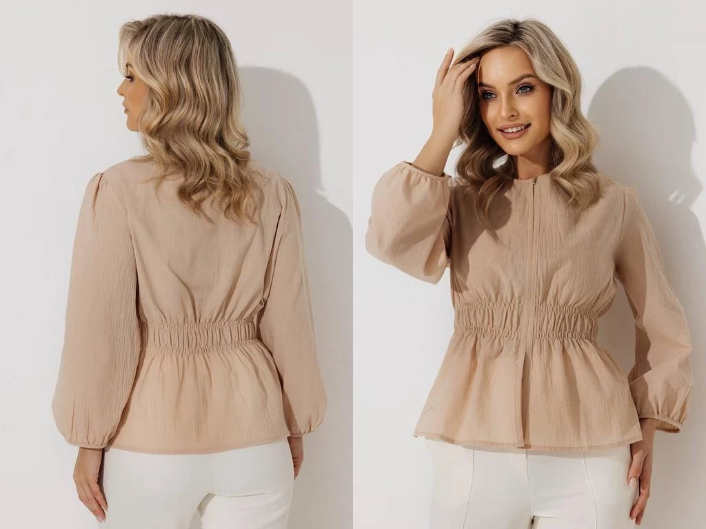 Не менее актуальными остаются и атласные ткани. Их мягкий блеск отражает свет и делает кремовый оттенок еще более выразительным. Особенно популярны модели с высоким воротником-стойкой, объемными рукавами или драпировками.