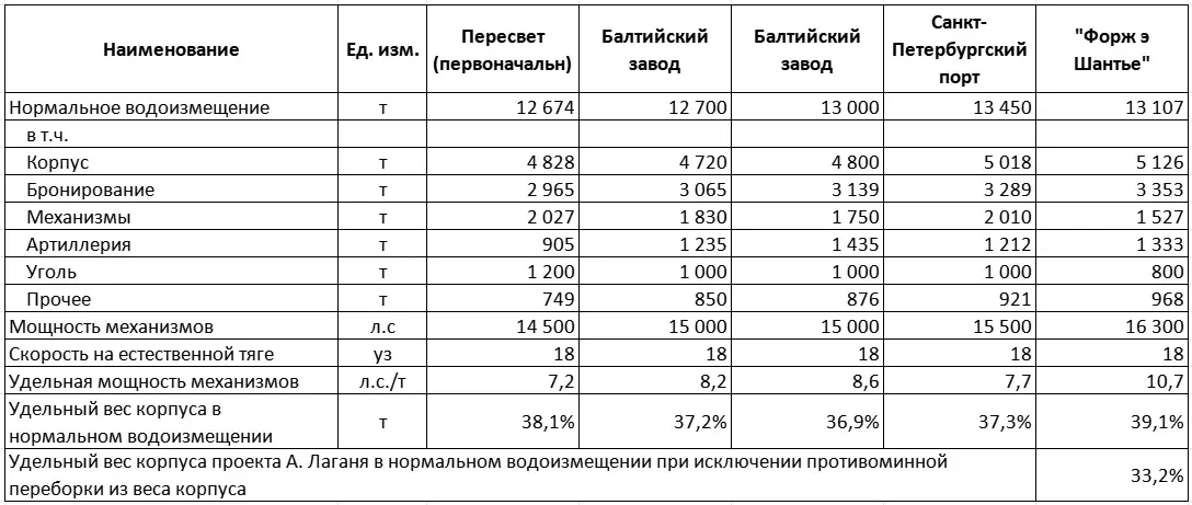 Но вернемся к проектам Балтийского завода и А. Лаганя. То, что французский броненосец оказался на 400 (если быть точным, то на 407) т тяжелее – это лишь половина дела. Потому что еще на 402,4 т французский кораблестроитель выиграл на экономии весов по разным статьям нагрузки, снизив таковые относительно проектного задания.