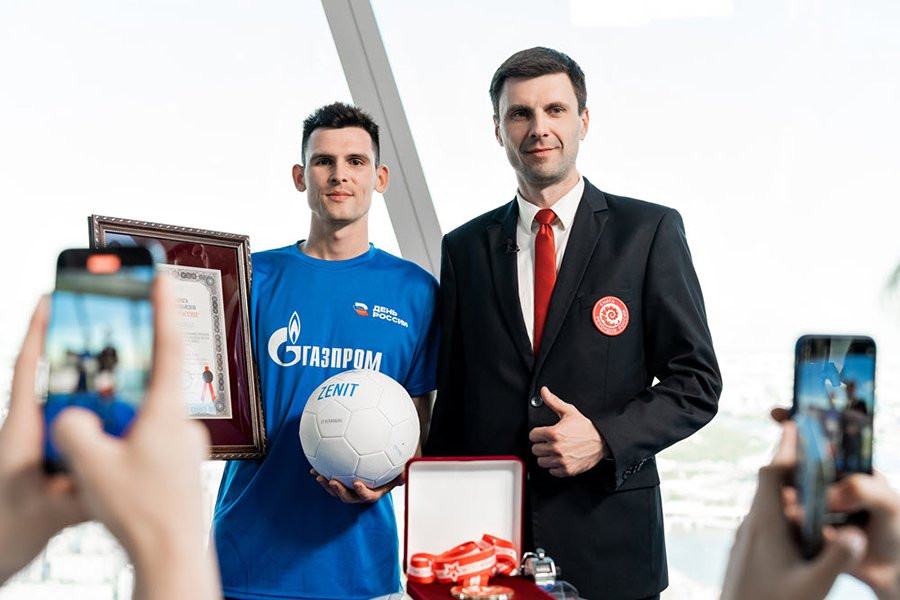 Футболист поднялся по лестнице на 83 этаж с мячом на шее и набил его 1203 раза, тем самым установив новый мировой рекорд по наибольшему количеству чеканки футбольного мяча на высоте более 300 метров в здании «Лахта Центра» — второго по высоте здания в Европе после Останкинской телебашни.